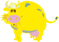 yellow cow with blue spotted knees.